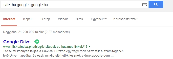 Ha csak annyit tudunk, hogy az adott weboldal domain végződése .hu (pl.:csibeszkemagazin.hu) és a .com, .eu, .org stb. domainekről származó találatokat ki szeretnénk zárni, akkor is használható a google site operátora, méghozzá a következő formában: